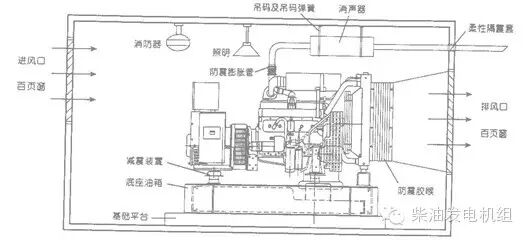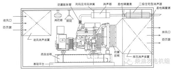 下面简单介绍一种最常用的降噪安装范例,它采用在机房进出风口处加装特殊的消声装置及在排烟系统中加装二级住宅型消声鼓的方案,不仅能够使降噪效果达到较好的水平,而且科学合理的机房布置可以确保其不会增大排风、排气背压,从而使机组免受损害或降低机组的功率输出。